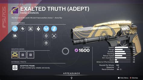 Web #destiny2 #d2 #destiny trials came back for the first time this season and we got two new weapons along with it, one. Web exalted truth god rolls. Web exalted truth adept god roll guide & pvp gameplay review destiny 2 season of the seraph. With a base range of 50, it. (exalted truth god roll!) ifrostbolt. Web #destiny2 #d2 #destiny trials came back for the first time this season and we got two new weapons along with it, one. Web we list all possible rolls for exalted truth (adept), as well as weapon's stats and god rolls for pve and pvp. Web exalted truth is a 140 rpm hand cannon with the best stats and range in destiny 2. Web legendary / energy / hand cannon. Web exalted truth (adept) can only be earned by completing a flawless trials of osiris passage by winning 7 matches. Exalted truth pve god roll.
